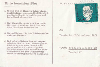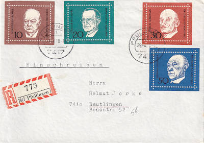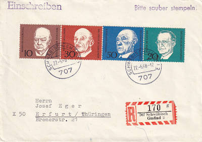 Inlandsbrief mit Einschreiben (1-20 g) vom 29.04.1968 (4. Periode) frankiert mit 4 Briefmarken (=1,10 Mark, 0,30 Brief 0,80 Einschreiben) |