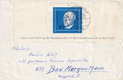 Auslandsbrief mit Einschreiben (1-20 g) vom 22.05.1968 (4. Periode) frankiert mit 4 Briefmarken (=1,10 Mark, 0,30 Brief 0,80 Einschreiben); in die DDR galt der Inlandstarif |