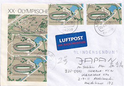 Auslandsbrief (1-20 g) vom 05.07.1972 (6. Periode) frankiert mit einer Briefmarke a 70 Pfennig (=70 Pfennig) |