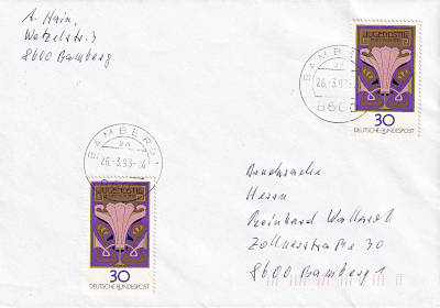 Inlandsdrucksache (1-20 g) vom 26.03.1993 (10. Periode) frankiert mit 2 Briefmarken a 30 Pfennig (=60 Pfennig) |