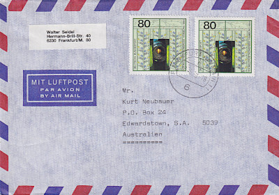 Auslandsbrief mit Luftpost (1-5 g) vom 17.05.1988 (9. Periode) frankiert mit 2 Brief-marken a 80 Pfennig (=1,60 Mark, 1,20 Brief 0,40 Luftpost) |