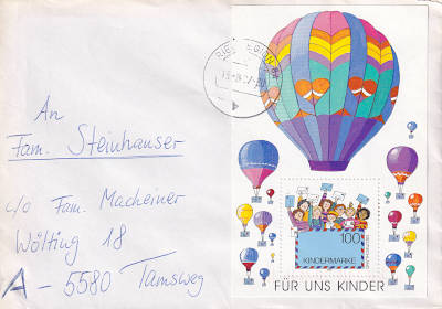 Auslandsbrief (1-20 g) vom 13.08.1997 (11. Periode) frankiert mit einem Block a 1 Mark (=1 Mark); nach Österreich galt der Inlandstarif |