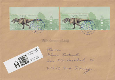 Inlandsbrief mit Einwurf-Einschreiben (1-20 g) vom 08.06.2021 (10. Periode) frankiert mit einem Block a 3 € (=3 €, 0,80 Brief 2,20 Einwurf-Einschreiben) |