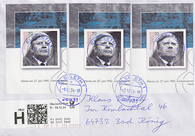 Inlandsbrief mit prioritärer Behandlung (51-500 g) vom 09.12.2024 (11. Periode) frankiert mit 3 Briefmarken a 70 Cent (=2,10 €, 1,60 Brief 1,10 Prio) |