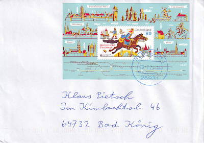 Inlandsbrief (21-50 g) vom 08.05.2025 (12. Periode) frankiert mit einem Block a 1,10 € (=1,10 €) |