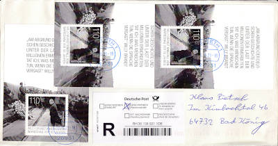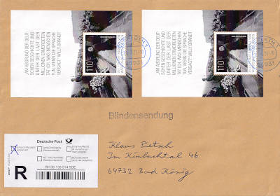 Inlandsblindensendung mit Einwurf-Einschreiben vom 25.05.2021 (10. Periode) frankiert mit 2 Blocks a 1,10 € (=2,20 €, 0 Blindensendung 2,20 Einwurf-Einschreiben) |