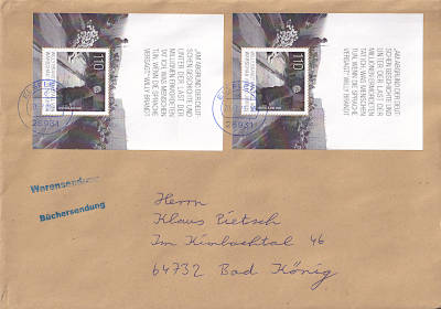 Inlandsbüchersendung (501-1 000 g) vom 20.07.2021 (10. Periode) frankiert mit 2 Blocks a 1,10 € (=2,20 €) |