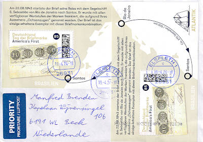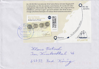 Auslandsbrief (21-50 g) vom 19.04.2024 (11. Periode) frankiert mit 2 Blocks a 85 Cent (=1,70 €) |