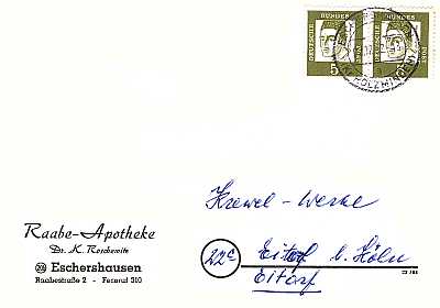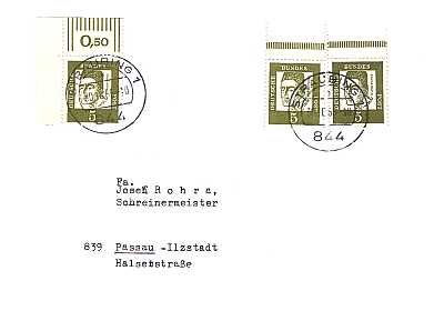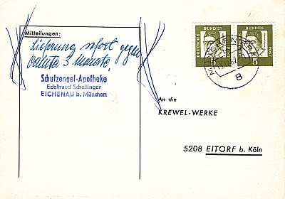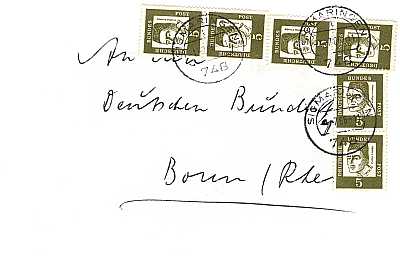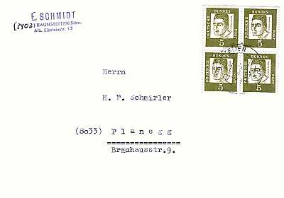 unterfrankierter Inlandsbrief (22 g) vom 02.03.1964 (3. Periode) frankiert mit 4 Marken a 5 Pfennig (=20 Pfennig; 50 Nachgebühr = 20 fehlendes Porto 30 Strafgebühr) |