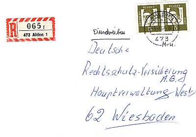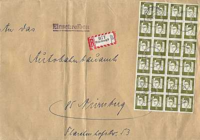 Inlandsbrief mit Einschreiben (1-20 g) vom 09.08.1967 (4. Periode) frankiert mit 22 Marken a 5 Pfennig (=1,10 Mark, 0,30 Brief 0,80 Einschreiben) |