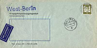 Inlandskriegsgefangenenangelegenheit mit Luftpost (1-20 g) vom 29.04.1963 (3. Periode) frankiert mit einer Marke a 5 Pfennig (=5 Pfennig, 0 Brief 5 Luftpost) |