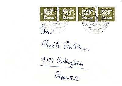 Inlandsbrief (1-20 g) vom 04.02.1964 (3. Periode) frankiert mit 4 Marken 5 Pfennig (=20 Pfennig) |