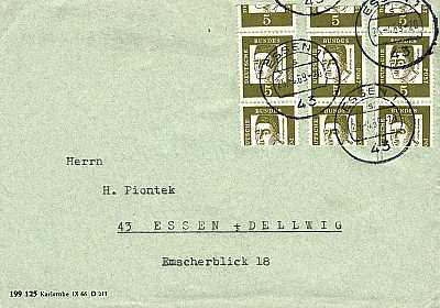 Inlandsbrief (1-20 g) vom 01.07.1966 (4. Periode) frankiert mit 6 Marken a 5 Pfennig (=30 Pfennig) |