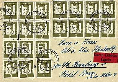 Inlandsbrief mit Eilzustellung (1-20 g) vom 31.07.1963 (3. Periode) frankiert mit 20 Marken a 5 Pfennig (=1 Mark, 0,20 Brief 0,80 Eilzustellung) |