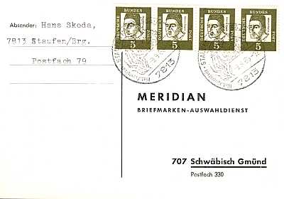 Inlandspostkarte vom 09.09.1966 (4. Periode) frankiert mit 4 Marken 5 Pfennig (=20 Pfennig) |