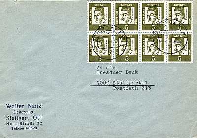 Inlandsbrief (21-50 g) vom 12.03.1964 (3. Periode) frankiert mit 8 Marken a 5 Pfennig (=40 Pfennig) |