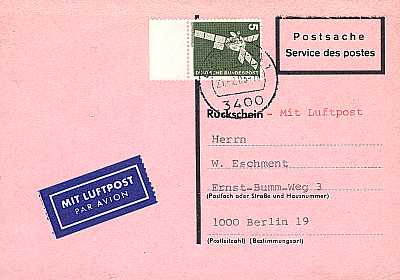 Inlandsrückschein mit Luftpost vom 21.02.1983 (9. Periode) frankiert mit einer Marke a 5 Pfennig (=5 Pfennig, 0 Rückschein 5 Luftpost) |