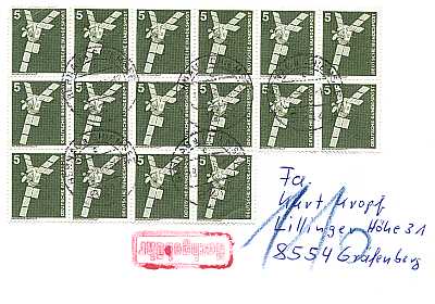 Inlandsbrief mit Einwurf-Einschreiben (51-500 g) vom 12.11.2001 (12. Periode) frankiert mit 120 Marken a 5 Pfennig (=6 Mark, 3 Brief 3 Einwurf-Einschreiben) |