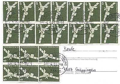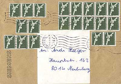 unterfrankierter Inlandsbrief (21-50 g) vom 18.06.1986 (9. Periode) frankiert mit 16 Marken a 5 Pfennig (=80 Pfennig, 110 Nachgebühr = 50 fehlendes Porto 60 Strafgebühr) |
