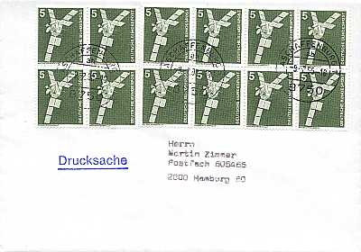 Inlandsdrucksache (1-20 g) vom 09.02.1990 (10. Periode) frankiert mit 12 Marken a 5 Pfennig (=60 Pfennig) |