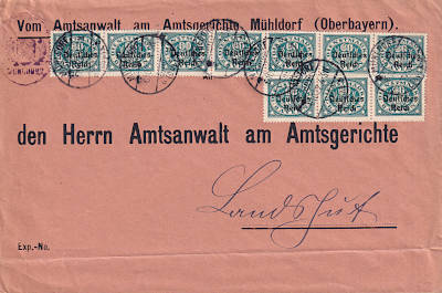 Inland cover (1-20 g) from 06.10.1922 (9. Period) franked with 10 stamps a 60 Pfennig (=6 Mark)