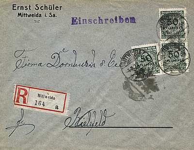 Inlandsbrief mit Einschreiben (1-20 g) vom 01.11.1923 (22. Periode) frankiert mit 3 Marken a 50 Millionen Mark (=150 Millionen Mark, 100 Millionen Brief 50 Millionen Einschreiben) |