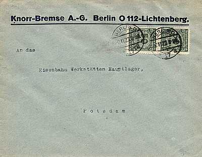 Inlandsbrief (1-20 g) vom 03.11.1923 (22. Periode) frankiert mit 2 Marken a 50 Millionen Mark (=100 Millionen Mark) |