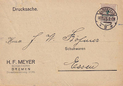 Inlandsdrucksache (1-25 g) vom 16.11.1923 (24. Periode) frankiert mit einer Marke a 2 Milliarden Mark (=2 Milliarden Mark) |