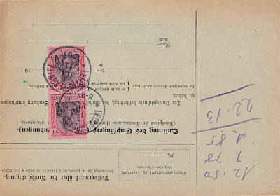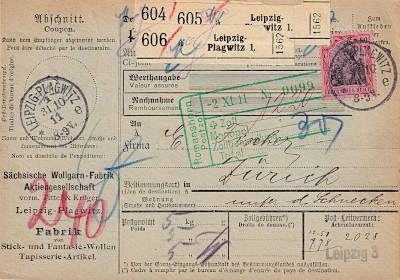 Auslandspaketkarte (3 500 g) vom 23.12.1913 frankiert mit 4 Marken a 20 Pfennig (=80 Pfennig)