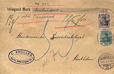 Auslandsbrief mit Wertangabe (100 Mark) (19 g) vom 31.08.1914 frankiert mit 2 Marken (=55 Pfennig, 20 Brief 35 Wert) |