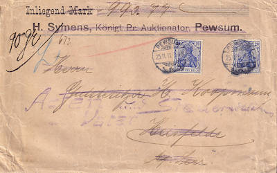 Inlandsbrief mit Wertangabe (990,77 Mark) (90 g, < 75 km) vom 25.11.1911 frankiert mit 2 Marken a 20 Pfennig (=40 Pfennig, 20 Brief 20 Wert) |