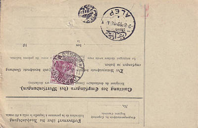 Auslandspaketkarte (5 000 g) vom 11.08.1917 frankiert mit 2 Marken (=2,60 Mark)