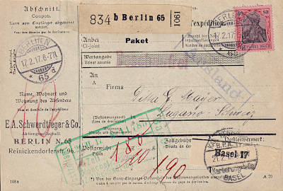 Auslandspaketkarte (4 400 g) vom 17.02.1917 frankiert mit einer Marke a 80 Pfennig (=80 Pfennig)