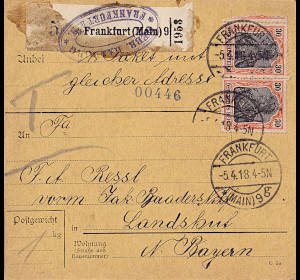Inlandspaketkarte (1 000 g, > 75 km) vom 05.04.1918 frankiert mit 2 Marken a 30 Pfennig (=60 Pfennig) |