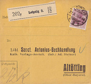Inlandspaketkarte (8 500 g, 75-150 km) vom 21.09.1918 frankiert mit 2 Marken (=1,10 Mark) |