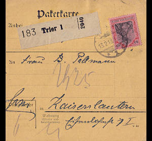 Inlandspaketkarte (6 000 g, 75-150 km) vom 13.02.1918 frankiert mit einer Marke a 80 Pfennig (=80 Pfennig) |