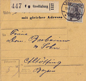 Inlandspaketkarte (1 500 g,> 75 km) vom 09.03.1919 frankiert mit 3 Marken a 25 Pfennig (=75 Pfennig)