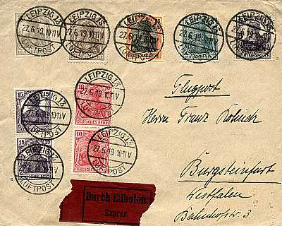 Inlandsbrief mit Eilzustellung und Luftpost (1-20 g) vom 06.02.1919 frankiert mit einer Marke a 1 Mark (=1 Mark) |