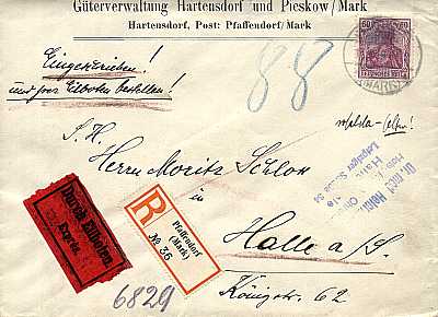 Inlandsbrief mit Einschreiben und Eilzustellung (1-20 g) vom 18.03.1919 frankiert mit einer Marke a 60 Pfennig (=60 Pfennig, 15 Brief 20 Einschreiben 25 Eilzustellung) |