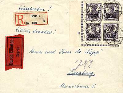 Inlandsbrief mit Einschreiben und Eilzustellung (1-20 g) vom 23.06.1919 frankiert mit 4 Marken a 15 Pfennig (=60 Pfennig, 15 Brief 20 Einschreiben 25 Eilzustellung) |