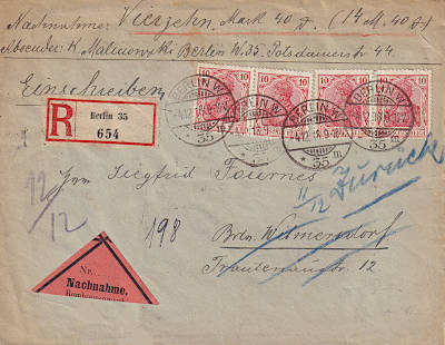 Ortsbrief mit Einschreiben und Nachnahme (1-20 g) vom 04.12.1918 frankiert mit 4 Marken a 10 Pfennig (=40 Pfennig, 10 Brief 20 Einschreiben 10 Nachnahme) |