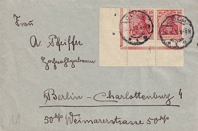 Inland cover (1-20 g) from 30.01.1920 franked with 2 stamps a 10 Pfennig (=20 Pfennig) |