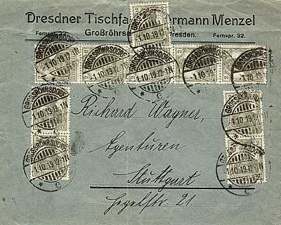 Inland cover (1-20 g) from 01.10.1919 franked with 10 stamps a 2 Pfennig (=20 Pfennig) |