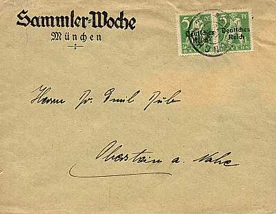 Inlandsdrucksache (1-50 g) vom 16.09.1920 frankiert mit 2 Marken a 5 Pfennig (=10 Pfennig) |
