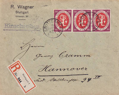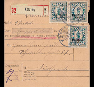 Inlandspaketkarte mit Einschreiben (7 000 g, > 75 km) vom 16.09.1920 frankiert mit 3 Marken a 1½ Mark (=4,50 Mark, 4 Paket 0,50 Einschreiben) |