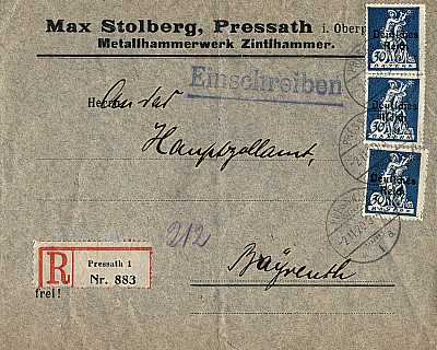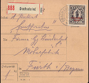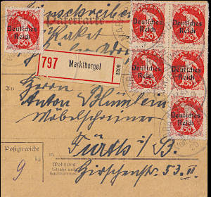Inlandspaketkarte mit Einschreiben (9 000 g, < 75 km) vom 18.05.1920 frankiert mit 6 Marken a 50 Pfennig (=3 Mark, 2,50 Paket 0,50 Einschreiben) |