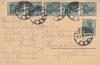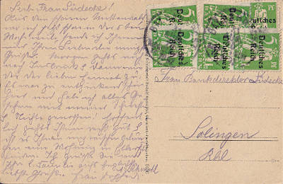 Inlandspostkarte vom 09.08.1920 frankiert mit 6 Marken a 5 Pfennig (=30 Pfennig) |