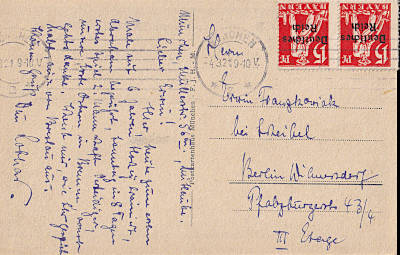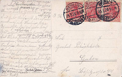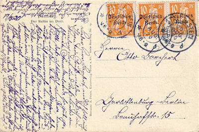 Inlandspostkarte vom 20.08.1920 frankiert mit 3 Marken a 10 Pfennig (=30 Pfennig) |