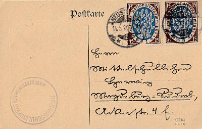 Inlandspostkarte vom 14.05.1920 frankiert mit 2 Marken a 15 Pfennig (=30 Pfennig) |
