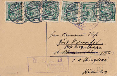 Inlandspostkarte vom 13.07.1920 frankiert mit 6 Marken a 5 Pfennig (=30 Pfennig) |